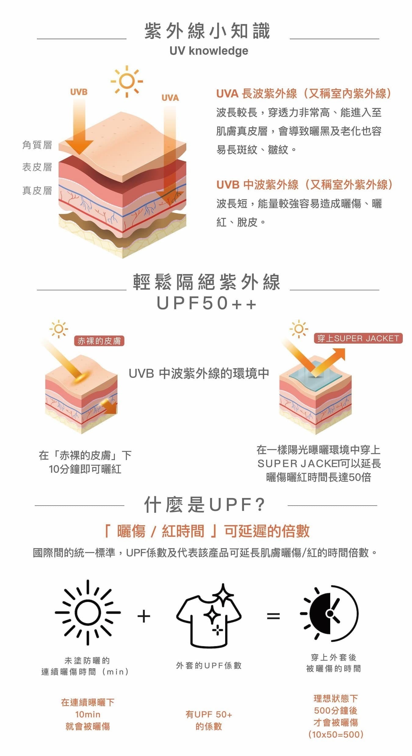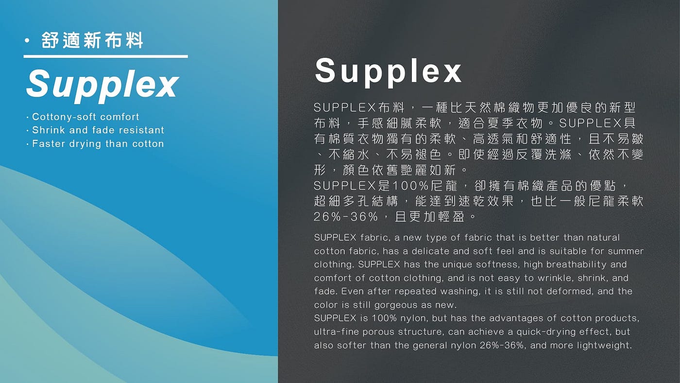 英威達的Coolmax 和 英威達(杜邦)的Supplex 等國際大廠的原紗布料,來確保使用者的安全性和布料的可靠性來作為防曬產品的主要布料